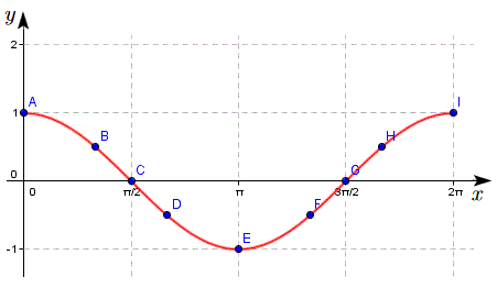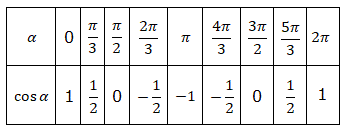 Anche la funzione coseno è periodica di periodo 2kΠ con k ∈ Z è e quindi è sufficiente tracciare il grafico nell'intervallo [0, 2Π] e poi completarlo ripetendo periodicamente sia a sinistra che a destra la parte del grafico già tracciato. Iniziamo a costruiamo la tabella α e cos α scegliendo alcuni opportuni angoli: