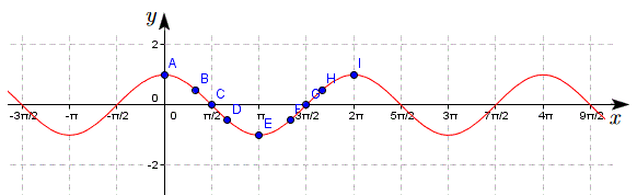Il grafico presenta sia infiniti punti di massimo di ascissa x=2kΠ e ordinata y=1 che infiniti punti di minimo di ascissa x=Π+2kΠ e ordinata y=-1.