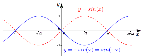 è simmetrica rispetto all'origine e si ottengono simmetrizzando rispetto all'origine rispettivamente y=cos(x), y=sin(x), y=tan(x). In particolare, essendo y=-sin(-x)=sin(x) i due grafici coincidono lo stesso vale anche per i grafici delle tangenti y=-tan(-x)=-tan(x) mentre y=-cos(-x)=-cos(x).