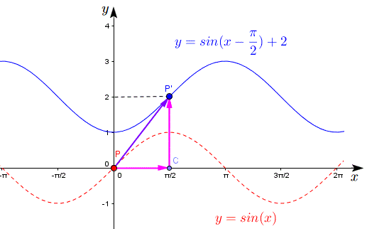 Ad esempio il grafico della funzione y=sin(x-Π/2)+2 dove a=Π/2 e b=2 si ottiene traslando il grafico di y=sin(x) orizzontalmente verso destra di Π/2 unità e verso l'alto di 2 unità.