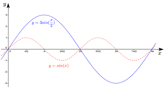 Ad esempio il grafico della funzione y=3sin(x/2) dove h=2 e k=3 si ottiene dal grafico di y=sin(x) con una dilatazione orizzontale di fattore 2 e con una dilatazione verticale di fattore 3. In pratica si moltiplicano le ascisse e le ordinate del grafico di y=sin(x) rispettivamente per 2 e per 3.