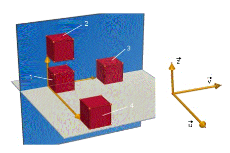 In figura vediamo, ad esempio, come il cubo 1 venga traslato rispettivamente nel cubo 2 se si applica una traslazione dello spazio di vettore z , nel cubo 3 se si applica una traslazione dello spazio di vettore v , nel cubo 4 se si applica una traslazione dello spazio di vettore u .