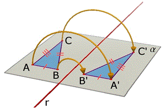 I triangoli ABC e A'B'C', se pensati come triangoli del piano α, sono congruenti per avere i lati corrispondenti congruenti. Posso sì sovrapporli, ma devo eseguire una simmetria rispetto all'asse r; tale simmetria equivale ad un ribaltamento cioè ad un movimento rigido fisicamente realizzabile nello spazio a tre dimensioni ma non nel piano (non posso ribaltare il triangolo ABC rimanendo nel piano, ho la necessità di uscire dal piano, ho bisogno di una dimensione in più). Nel piano, i due triangoli sono quindi inversamente congruenti. Ora, se i due triangoli sono pensati nello spazio posso sovrapporli con un movimento fisicamente realizzabile e quindi sono direttamente congruenti.