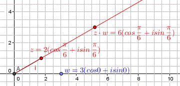 Pertanto i due numeri complessi z e z⋅w avendo lo stesso argomento stanno sulla stessa semiretta avente origine in O del piano di Gauss e ciò significa che si possa dal punto z al punto z⋅w con una omotetia con un fattore uguale al modulo di w. Nel nostro caso essendo il modulo di w uguale a 3 si passa da z a z⋅w con un'omotetia di fattore 3.