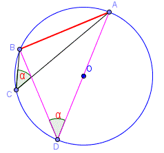 Il triangolo ABD è rettangolo in B perchè inscritto in una semicirconferenza, inoltre l'angolo ADB è uguale all'angolo ACB perchè insistono sullo stesso arco AB e quindi hanno la stessa misura α. Possiamo ora determinare la misura della corda AB utilizzando le relazioni tra lati angoli del triangolo rettangolo ABD: