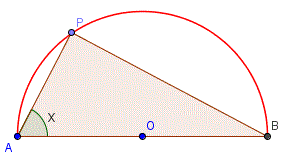 La posizione del punto P dipende dall'ampiezza dell'angolo PAB pertanto conviene indicare con x tale angolo. Inoltre, essendo il triangolo APB rettangolo in P (triangolo inscritto in una semicirconferenza) l'angolo x può variare solo nell'intervallo
