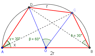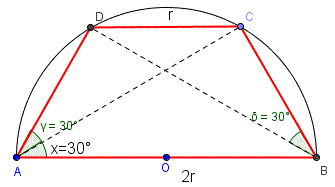 Il problema ammette per soluzione x=30° e il quadrilatero ABCD risulta un trapezio isoscele con gli angoli alla base maggiore di 60° (può essere considerato anche come la metà dell'esagono regolare inscritto nella circonferenza di diametro AB).