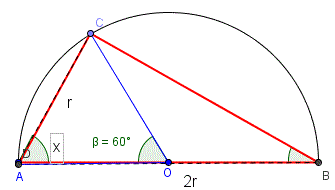 Osserviamo che la corda CD avendo misura r è il lato dell'esagono regolare inscritto nella circonferenza di diametro AB ne segue che l'angolo al centro sotteso dall'arco CD è di 60° e quindi gli angoli alla circonferenza sottesi dall'arco CD misurano 30° pertanto si ha: