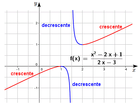 Ne segue che nei due intervalli infiniti x < 1 e x > 2 la funzione è crescente, mentre negli intervalli 1 < x < 3/2 e 3/2 < x < 2 è decrescente come si può osservare dal grafico della funzione.