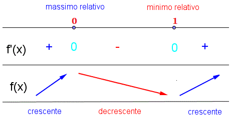Pertanto il punto x1 = 0 è un punto di massimo relativo perchè la funzione è crescente in un intorno sinistro di x1 ed è decrescente in un intorno destro di x1, mentre il punto x2 = 1 è un punto di minimo relativo perchè la funzione è decrescente in un intorno sinistro di x2 ed è crescente in un intorno destro di x2.