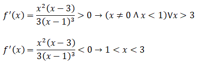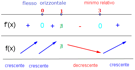Pertanto il punto x1 = 0 è un punto di flesso orizzontale crescente perchè la funzione è crescente sia in un intorno sinistro di x1 sia in un intorno destro di x1, mentre il punto x2 = 3 è un punto di minimo relativo perchè la funzione è decrescente in un intorno sinistro di x2 ed è crescente in un intorno destro di x2.