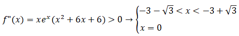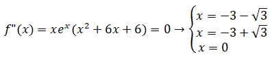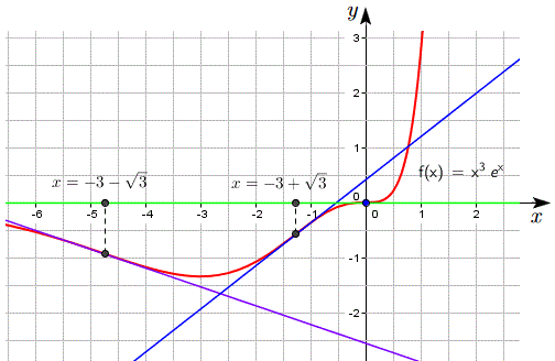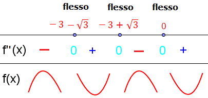 I punti x=-3-√3 e x=-3+√3 sono di flesso a tangente obliqua perchè sono zeri di f"(x) e f"(x) cambia segno nell'intorno di questi punti, mentre il punto x=0 è un punto di flesso a tangente orizzontale perchè f'(0)=0.