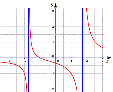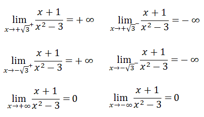 Il denominatore si annulla per x=±√3 per cui la funzione ha due asintoti verticali di equazione rispettivamente x=+√3 e x=-√3 inoltre, essendo il grado del numeratore minore del grado del denominatore ha anche un asintoto orizzontale di equazione y=0. Verifichiamo: