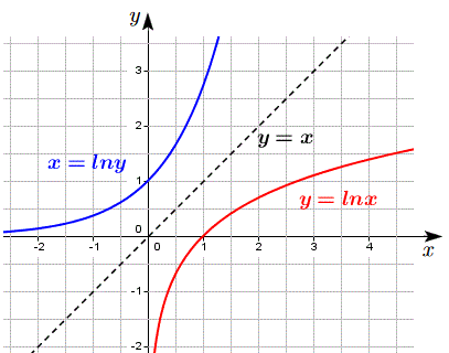 Ad esempio data la funzione y = ln x la corrispondente funzione inversa è x = ln y. La funzione y=f(x) e la sua inversa x=f(y) hanno come grafico due curve simmetriche rispetto alla rette y=(x).