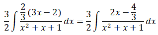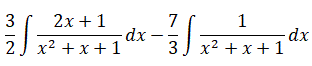 Scomponiamo la funzione fratta in due frazioni in modo che il numeratore della prima frazione sia la derivata del denominatore ossia 2x+1. Moltiplicando e dividendo per 2/3 possiamo ottenere al numeratore 2x (il primo termine della derivata del denominatore).
