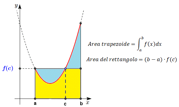 Dal punto di vista geometrico questo teorema esprime l'equivalenza tra la superficie del trapezoide e la superficie del rettangolo avente la stessa base del tapezoide (b-a) e altezza f(c) dove c è un punto nell'intervallo [a, b].