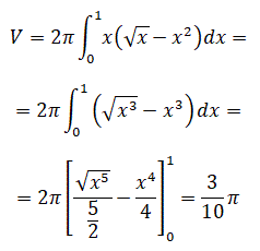 Esempio 2: Calcolare il volume del solido ottenuto dalla rotazione attorno all'asse y della regione di piano limitato superiormente dalla funzione g(x)=√x e inferiormente dalla funzione f(x)=x2 sull'intervallo [0, 1].