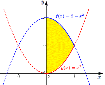 Esempio 3: Calcolare il volume del solido ottenuto dalla rotazione attorno all'asse y della regione di piano limitata superiormente da f(x)=2-x2 e inferiormente da g(x)=x2 sull'intervallo [0, 1].