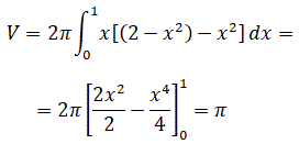 Un altro modo di risolvere questo problema consiste nel considerare che la regione di piano sia limitata superiormente dalla curva f(x)=1, ed inferiormente dalla curva g(x)=x2, sull'intervallo [0, 1], in tal caso il volume del solido ottenuto dalla rotazione attorno all'asse y è dato: