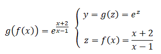 La funzione, di cui dobbiamo calcolare il limite, è formata dalla composizione di due distinte funzioni; una funzione esponenziale y=g(z) e una funzione razionale fratta z=f(x). La funzione g(z) ha per argomento la funzione f(x), in questi casi si dice che la funzione g(z) contiene la funzione f(x) oppure si dice che la funzione g(z) è esterna mentre la funzione f(x) è interna alla funzione g(z) e si scrive: