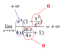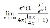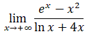 Il limite si presenta nella forma indeterminata (∞-∞)/∞. Sapendo che al numeratore la funzione ex va a infinito più rapidamente di x2 e al denominatore la funzione 4x va a infinito più rapidamente di lnx mettiamo a fattore comune ex al numertore e 4x al denomitatore :