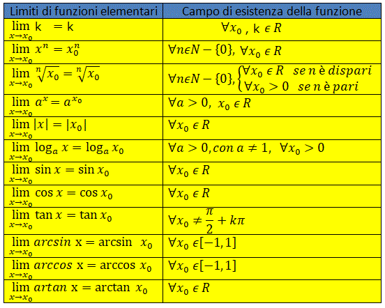 Possiamo quindi riassumere i limiti delle principali funzioni elementari continue nel punto x0 nella tabella: