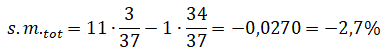 La probabilità di vincere è 3/37 e quella di perdere è 34/37. Se ogni puntata del giocatore è di 1 € la speranza matematica totale è: