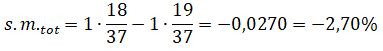 Rosso o Nero. Con Rosso si punta sui numeri colorati di rosso mentre con Nero si punta su quelli neri, se uno dei diciotti numeri scelti esce il banco paga 1 volte la posta e restituisce la puntata. La probabilità di vincere è 18/37 e quella di perdere è 19/37. Se ogni puntata del giocatore è di 1 € la speranza matematica totale è: