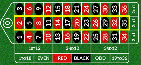 Colonna. Si punta su una delle tre colonne ciascuna di 12 numeri, se uno dei dodici numeri scelti esce il banco paga 2 volte la posta e restituisce la puntata.