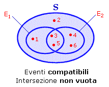 Poichè un evento è un insieme, ogni proprietà, relazione alle operazione tra insiemi può essere tradotta nel linguaggio degli eventi. Ad esempio, due sottoinsiemi E1 ed E2 di un insieme S possono essere disgiunti oppure avere intersezione non vuota. Nel primo caso, interpretando i due sottoinsiemi come eventi, diremo che E1 ed E2 sono eventi incompatibili (non possono verificarsi contemporaneamente o, equivalentemente, se si verifica uno non può verificarsi l'altro); nel secondo caso diremo invece che sono eventi compatibili (possono verificarsi contemporaneamente). Ad esempio, pensando al lancio di un dado, sono incompatibili gli eventi:E1 = Si presenta un numero dispari