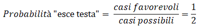 e la probabilità dell'evento esce testa è data dal rapporto tra il numero di casi favorevoli (nel nostro caso 1) e il numero dei casi possibili (nel nostro caso 2).