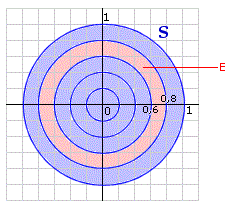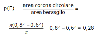 Qual è la probabilità di E? I casi favorevoli sono tutti i punti della corona circolare evidenziata in figura ed è quindi ragionevole misurare l'evento E considerando l'area di tale regione; la misura dello spazio campione S sarà naturalmente l'area del bersaglio, cioè del cerchio unitario, che è Π. E allora la probabilità dell'evento E è: