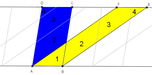 Due parallelogrammi equivalenti e aventi una base comune sono anche equiscomponibili. Ad esempio, i due parallelogrammi ABCD e ABEF in figura sono equivalenti e hanno la base AB in comune e quindi necessariamente hanno anche la stessa altezza.