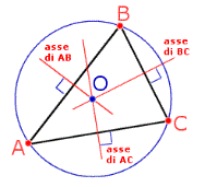I tre assi si intersecano nel punto O e hanno infiniti punti in comune. Il punto O essendo comune ai tre assi è equidistante dai tre punti A, B, C. Possiamo quindi tracciare la circonferenza di centro O e passante per i tre punti come si vede in figura.