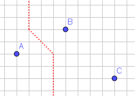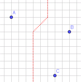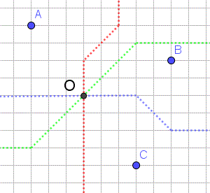 Consideriamo tre punti di taxi A, B, C non allineati e tali che le distanze di taxi tra ogni coppia di punti sia un numero pari di unità (con questa scelta possiamo tracciare, per ogni coppia di punti l'asse di taxi).