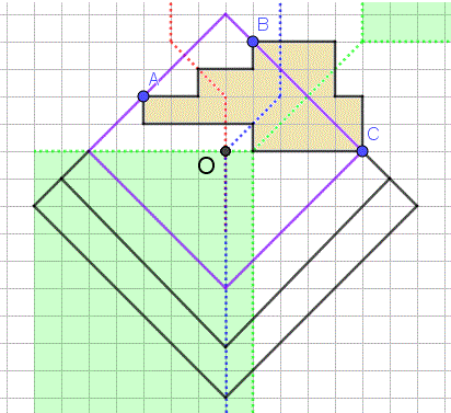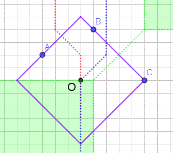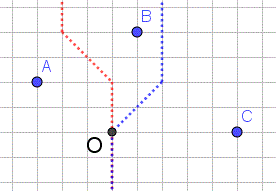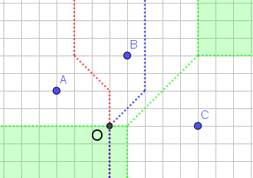Come si vede dalla figura i due assi di taxi si intersecano nel punto O e hanno infiniti punti in comune. Tracciamo l'asse di taxi del segmento di taxi BC