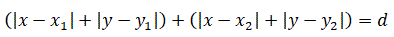 Anche nella geometria di taxi, se i due fuochi A e B coincidono l'ellisse diventa una circonferenza. Nel piano cartesiano di taxi l'equazione dell'ellisse che ha i fuochi in A(x1, y1), B(x2, y2) e distanza costante d è data da: