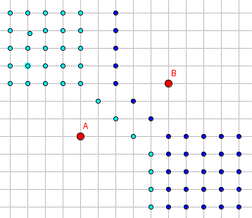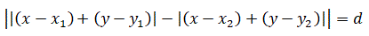 Nel piano cartesiano di taxi l'equazione dell'iperbole che ha i fuochi in A(x1, y1), B(x2, y2) e differenza costante d è data da: