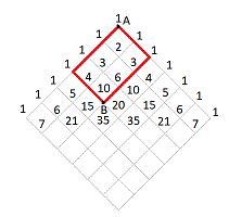 Lo schema precedente è lo stesso del triangolo di Tartaglia ed è possibile associare i due schemi per determinare il numero dei segmenti di taxi o del percorso dei taxi come si vede in figura.