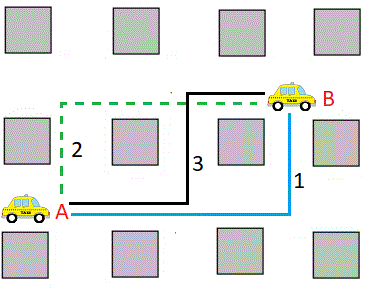 Invece, nella geometria del taxi la distanza minima o segmento di taxi può non essere unica. Ad esempio, in figura ci sono tre distanze minime tra i due punti A e B. Questo vuol dire che se il tassista partendo da A si avvicina continuamente alla destinazione B ha a sua disposizione tre possibili percorsi minimi alternativi.