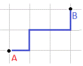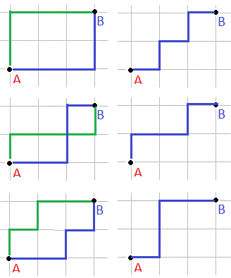 Se due punti A e B non si trovano su una stessa strada orizzontale (o verticale) quanti sono i segmenti di taxi distinti che uniscono i due punti? Ad esempio, quanti percorsi di taxi sono possibili tra i punti A e B di una città ideale con minimo chilometraggio?