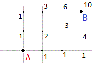 Esiste anche una formula per calcolare il numero di percorsi minimi tra A e B; se indichiamo con m e n le rispettive distanze orizzontale e verticale tra i due punti allora il numero N dei percorsi minimi è: