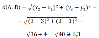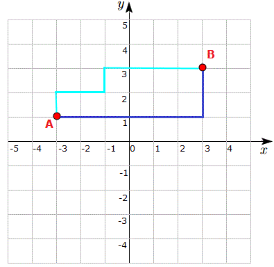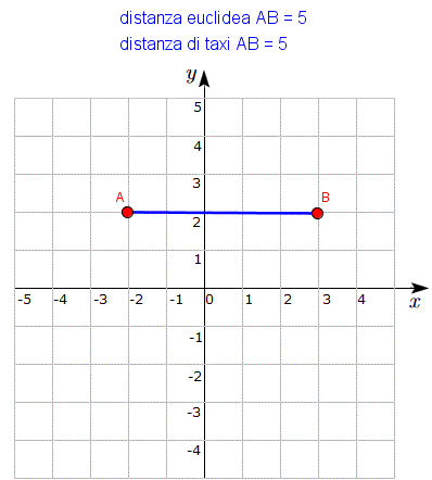 Pertanto la distanza tra A e B è uguale alla somma delle lunghezze euclidee di due segmenti paralleli agli assi e se si vuole esprimere la distanza in funzione delle coordinate allora è data dalla somma delle differenze assolute delle corrispondente coordinate.