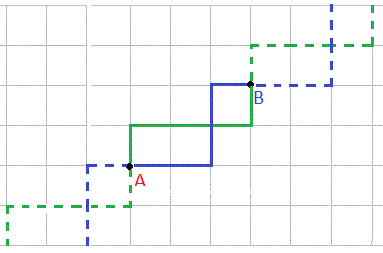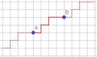 Però questa non è l'unica retta di taxi che passa per i due punti A e B se questi non sono allineati orizzontalmente o verticalmente. Come abbiamo visto, il segmento di taxi che unisce due punti A e B può non essere unico e le rette di taxi che passano per A e B sono tante quanti sono i segmenti di taxi. Infatti, ogni segmento di taxi che unisce i due punti A e B può essere prolungato indefinitamente conservando la forma. Ad esempio, prolungando i due segmenti di taxi AB si ottengono le due rette di taxi passanti per i due punti.