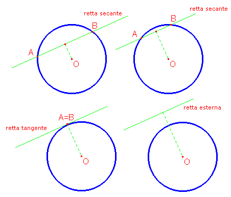 I due punti di intersezione A e B tendono ad avvicinarsi, fino a coincidere quando la distanza della retta dal centro è uguale al raggio. In questo caso si dice che la retta è tangente alla circonferenza (la retta tangente tocca la circonferenza in un solo punto). Spostiamo ancora la retta tangente parallelamente a se stesso. La retta non ha più punti in comune con la circonferenza e la sua distanza dal centro è maggiore del raggio. Si dice che la retta è esterna alla circonferenza.
