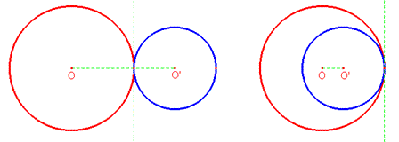 Anche due circonferenze possono essere tangenti, cioè avere un solo punto in comune e ciò avviene in due casi. Sono tangenti esternamente quando la distanza tra i due centri è uguale alla somma dei raggi, mentre sono tangenti internamente quando la distanza tra i due centri è uguale alla differenza dei raggi.