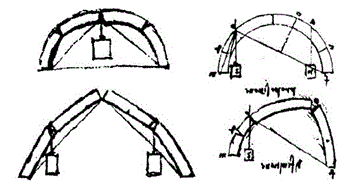 Leonardo da Vinci si interessò e studiò gli archi a tutto sesto. Fu il primo a rilevare esplicitamente il concetto di spinta. Per Leonardo l'arco è una fortezza derivata da due debolezze. Arriva a questa conclusione con il seguente ragionamento. L'arco è composto da due quarti di circonferenza, ognuno dei quali è debolissimo perchè da solo non è in grado di reggersi e quindi per sua natura tenderebbe a cadere. Però, questi due quarti di circonferenza opponendosi l'uno all'altro nella caduta, trasformano le loro debolezze in un'unica fortezza. Nei codici di Madrid disegna le possibili rotture di un arco a tutto sesto quando è soggetto a particolari carichi. In particolare, afferma che se un arco è caricato nel suo punto medio con un peso maggiore della sua resistenza allora si romperà in ciascun quarto della sua lunghezza.