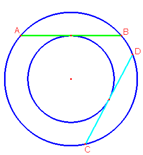 Se due circonferenze hanno la stesso centro e diverso raggio si dicono concentriche. Tracciamo due circonferenze concentriche e consideriamo le corde della circonferenza più esterna che siano anche tangenti alla circonferenza più interna.