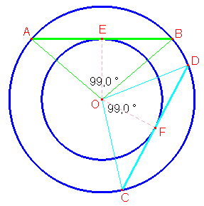 No! Tutte le corde sono tra loro congruenti. Infatti essendo tangenti alla circonferenza più interna hanno la stessa distanza dal centro O e i raggi OE e OF essendo perpendicolari alle corde le incontrano nel loro punto medio. Possiamo allora concludere che i triangoli rettangoli OEB e OFD sono uguali e sono uguali anche i triangoli rettangoli OEA e OFC e quindi le due corde sono uguali. Lo stesso ragionamento può essere fatto per tutte le altre corde.