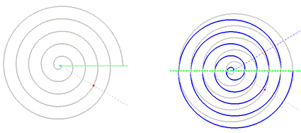 Nella spirale i tratti curvilinei generati dalla rotazione di un giro completo della semiretta sono detti spire e la distanza tra il polo e un punto della spirale è detto raggio vettore. Come si può vedere dalla figura questo tipo di spirale, detta di Archimede, è uniforme perchè cresce con lo stesso passo, cioè la distanza tra due spire successive è costante. Questo perchè, ogni volta che la semiretta compie un giro completo, il punto si allontana di una lunghezza costante dall'origine. Ora, la semiretta può ruotare intorno alla sua origine sia in senso antiorario come nella figura precedente sia in senso orario. Le due spirali sono simmetriche tra loro rispetto alla retta che contiene la semiretta nella sua posizione iniziale e si intersecano in infiniti punti lungo l'asse comune.